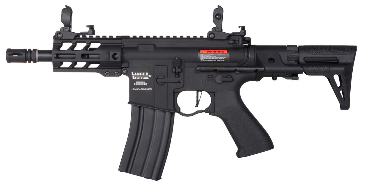 Airsoft samopal od spoločnosti Lancer Tactical model LT-34 Gen2 ProLine Enforcer Battle Hawk PDW 4´ Full metal AEG v kal. 6 mm BB. Prevedenie FULL METAL určite nesklame ani tých najnáročnejších. Má kovové telo, kovovú hlaveň s priemerom 6.03 mm a s dĺžkou 200 mm, teleskopickú pažbu, nastaviteľné mieridlá, zásobník s kapacitou 120 BB guľôčok, režim streľby semi + full auto, poistku proti nechcenému výstrelu a dlhú montážnu lištu s priemerom 22 mm, na ktorú môžete nainštalovať napr. kolimátor. Energia strely je maximálne 1.00 J a úsťová rýchlosť sa v závislosti od hmotnosti guľôčky pohybuje okolo 100 m/s (330 fps). Nechýba ani nastaviteľná funkcia Hop-Up. Celková dĺžka je od 520 mm do 610 mm a hmotnosť je 2 405 g. Súčasťou balenia nie je batéria s nabíjačkou. Replika má konektor typu T-dean na akumulátor. Odporúčanou batériou je tyčová LiPo batéria s napätím 7.4 V (kód produktu: AP135). Pre použitie batérie je potrebný extender s kódom produktu AP134 a redukcia konektoru T-dean na mini Tamiya. Séria ProLine ďalej ponúka kovový GEARBOX, oceľový GEAR SET (18:1), vysokorýchlostný motor (Neodyn 25K), systém Quick Spring Change QSC®, nízkoodporovú kabeláž a spúšť so systémom ETU (Electronic Trigger Unit).Airsoft samopal Lancer Tactical LT-34 G2 ProLine Enforcer Battle Hawk PDW 4´ Full metal, AEGZásobník, 1 ksNávod + záručný listVýrobca: Lancer TacticalKaliber: 6 mm BBPrincíp fungovania: elektrický (AEG)Režim streľby: semi + full autoOdporúčané strelivo: od 0.20 g do 0.25 gKapacita zásobníka: 120 BBEnergia strely: do 1.00 JTyp konektora: T-deanCelková dĺžka: od 520 mm do 610 mmHmotnosť: 2 405 gSystém spúšte: DAMieridlá: nastaviteľnéMateriál konštrukcie: FULL METALPoistka: áno