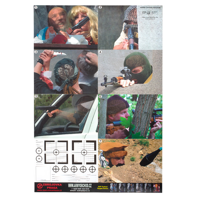 Taktický terč na výcvik streľby s puškami typ sniper pre ostreľovačov. Terč pozostáva z ôsmich sekcií, sedem z nich predstavujú rôzne modelové situácie, s ktorými sa profesionálny odstreľovač môže stretnúť v praxi a jedna slúži na nastrelenie pušky zo štandardnej vzdialenosti 100 m. Rozmer terča je 600 x 880 mm.Terč, 1 ksRozmer: 600 x 880 cm