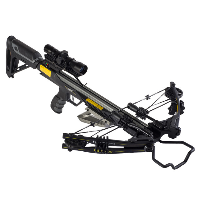 Kuša Ek-Archery HEX 400Športová, kladková lovecká kuša z dielne Ek-Archery, určená do rúk náročných a skúsených strelcov. Tento model sa vyznačuje svojou silou a kompaktnou veľkosťou. Rýchlosť šípu je až do 400 Fps (121.92 m/s). Dĺžka kuše bez vysunutej pažby je len 85.09 cm ( 33.5“), strelec tak má oveľa lepšiu obratnosť. Výrobca uložil spúšť bližšie k ramenám pre získanie kompaktného tvaru kuše s tzv. Bullpup konfiguráciou. Napínacia sila alebo sila náťahu je 210 Lbs. Na kušu je možné nainštalovať aj naviják s kódom produktu PK133, ktorý Vám uľahčí napínanie (rozloží odporovú silu).Systém kladiek opracovaný CNC strojom. Ramená: odolne zlisovaný sklolaminát, quad limb design. Chránič prstov zabraňuje nechcenému položeniu prstov na koľajnicu. Zo spodu tela kuše je ďalšia Picatinny (22 mm) lišta pre osadenie doplnkov ako laser alebo svietidlo. Predná pažba prináša ultra stabilný úchop. Pažba je zosilnená, s lícnicou. AR Grip: ergonomicky spracovaná pažbička s drážkami na prsty pre lepšie ovládanie za hocijakých podmienok. Spúšť s odporom menej ako 3.5 lbs. ADF – má automatickú poistku proti nechcenému výstrelu, obojstrannú. Hlaveň je tvrdená zliatina duralu. Má picatinny lištu, na ktorú viete osadiť optiku na kuše. Novší tlmič tetivy spomaľuje tetivu a tlmí vibrácie (nižšia hlučnosť, dlhšia životnosť).POZOR ! Kušou sa nesmie strieľať naprázdno !Názor predajcu: Táto kuša je extrémne silná, malá a kompaktná so všetkými prvkami ako pri drahších amerických modeloch. Teda cenovo dostupnejšia. AR- rukoväť sa drží viac ako perfektne, celú kušu tak viete ľahko obracať. Kuša kladková HEX 210 Lbs čiernaPuškohľad 4 x 32Šípy 20" karbónové, 3 xDržiak šípov NaťahovačVoskNávod so záručným listomNapínacia sila: 210 lbs/ 95.25 kgRýchlosť: 395 FPS / 370gn ; 400 FPS / 360gn (121.92 m/s)Typ kuše: kladkováDĺžka náťahu: 13.25“ (33.66 cm)Os ramien: 14.75“ – nenapnuté / 18.75“ napnutéRamená: High-Tech sklolaminát za tepla lisovaný, špec. zliatinaPicatinny lišta: 22 mmPažba: teleskopicá - nastaviteľnáDĺžka: 90.1 – 96.52 cm (35.5 – 38“)Hmotnosť: 3.03 kg (6,7 Lbs)Farba: čierna