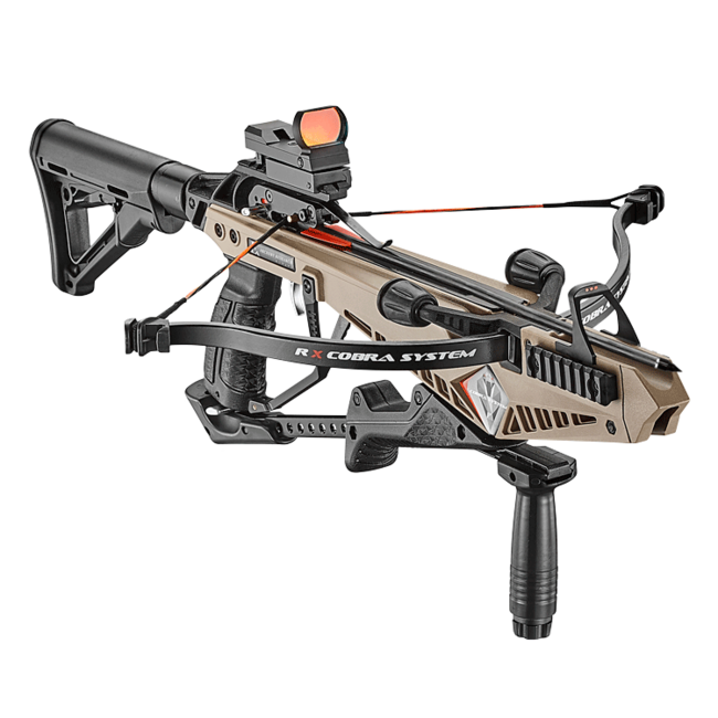 Cobra system RX:Karabínová kuša Cobra system RX je určená pre rýchleho strelca, napína sa integrálnou (napínacou) pákou. Silový náťah Cobry RX v dĺžke 7,5“ (19.05 cm), streľba výhradne 245 grainovým 15“ karbónovým šípom. Úsťová rýchlosť je 230 fps, čo je približne 70.10 m/s.Lučisko so 130 lbs môže byť rýchlo odstránené a odinštalované bez náradia, takže kuša môže byť kompaktne skladovaná v kufri alebo taške. Táto jednoduchá rozborka spĺňa EU požiadavky, podľa ktorých kuša musí zostať nefunkčná počas prepravy. Ergonomicky navrhnutý rám a pištoľové uchopenie s vlastnosťami spojovacieho zariadenia (tzv. tubus) - ktoré dovoľujú pridať AR- style skladacej alebo teleskopickej pažby. Cobra systém RX má niekoľko veľmi dobre umiestnených Picatinny líšt, ktoré umožňujú osadiť rôzne príslušenstvo. Tento nový model Cobry RX je skutočným lídrom. Cobra Systém RX:- Ek´ novo vylepšený karabínový terčovnicový model,- Silné 130 lbs lučisko je nabíjané integrovanou nabíjacou pákou,- Vylepšenie s tlmičmi tetivy, ktoré redukujú vibrácie a hluk,- RX je navrhnutá na streľbu 15“ Ek´ karbónovým šípom 230 fps (70.10 m/s), vyhovuje pre malé lovenie,- Rozšírenie s novým duralovým kolimátorom, AR15 Mil-Spec pažbou a brutálnou púštnou camo farbou,- Konfigurované s tromi picatinny lištami, možnosť osadiť ďalším príslušenstvom,- Prvky R9 rýchlej rozborky a robustný poistný systém & Anti Dry Fire systém.Názor predajcu: A je to tu! Špecialita s jedinečným naťahovacím systémom, spodný náťah pákou, ktorá je zaistená resp. zamknutá v spodku pažby a ovláda sa jednou rukou, veľmi efektívne – rýchlo a ľahko, pričom mechanizmus poistky je pevný a stabilný. Prevedenie RX a jej celkový dizajn sú naozaj nadštandardné, rukoväť kuše je o niečo väčšia ako pri klasických výkonných kušiach, čo vedie strelca k väčšej istote. Unikátna je rozborka, pomocou dvoch kolíkov jednoducho vytiahnete lučisko a pažbu. Spozornieť by ste mali aj pri výkone, kde neporovnávame rýchlosť klasickou pištoľovou šípkou, ale špeciálnym 15“ šípom priemeru 8 mm, s úsťovou rýchlosťou až 230 Fps. Balenie obsahuje viacero zariadení, ktoré skvalitňujú používanie. Pri streľbe na terč môžete vidieť nečakanú presnosť zbrane, zaujímavé sú aj pevné mieridlá – 4 bodové, s ktorými je streľba na krátku vzdialenosť šokujúco presná. Kušu vieme označiť za svojský špeciál, ktorý vyčnieva zo všeobecnej kategórie, v ktorej je určite číslom jeden. POZOR! Kušou sa nesmie strieľať naprázdno!Kuša Cobra RX, 130 LbsAR15 Mil-Spec pažba s tubusomKolimátor hliníkovýPredná rukov䝊ípy karbónové 15" – 6 ksPopruhVoskNávod so záručným listomNapínacia sila 130 LbsRýchlosť letiaceho šípu: 230 Fps (70.10 m/s)Poistka: ADF, automatickáDĺžka kuše (základ): 21.5" - 54.6 cmPažba: teleskopickáHmotnosť: 1.96 kgFarba: púštny camo vzor