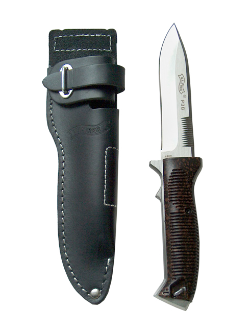 Nôž Walther P38 sa radí svojou kvalitou spracovania medzi jedinečné nože. Je výnimočný obzvlášť svojim mimoriadnym dizajnom v osobitej kombinácii rukoväte a čepele. Rukoväť tohto noža je totiž kópiou rukoväte známej pištole Walther P38. "Pažbičky" sú identické ako u ostrej zbrane.Svojou netradičnou konštrukciou spĺňa požiadavky zberateľov, ako aj náročnejších zákazníkov z oblasti tohto typu obrany, športu a zábavy. Možno ho využiť aj ako lovecký nož. Čepeľ je extrémne silná oceľ 440 C, 5 mm. Ide o väčší nôž s hladkým ostrím, ku ktorému sa dodáva aj originálne kožené puzdro.Unikátny, veľký nôž s hladkým ostrím od popredného výrobcu zbraní Umarex. Odporúčame.Nôž Walther P38Kožené puzdroTyp noža: pevnýMateriál čepele: oceľ 440 CŠpička čepele: klasickáOstrie čepele: hladkéDĺžka čepele: 135 mmCelková dĺžka: 260 mmHmotnosť: 286 gPuzdro: koža WaltherNemecká značka Walther sa preslávila vďaka svojej bohatej ponuke strelných zbraní, najmä pištolí. Vďaka popularite tejto značky vznikol dopyt napr. po airsoftových a vzduchových zbraniach tejto značky. Preto sa značka Walther rozhodla udeliť licenčné práva na výrobu airsoftových a vzduchových replík jej modelov zbraní. V súčasnosti takéto licencované repliky vyrába napr. spoločnosť Umarex (Nemecko).