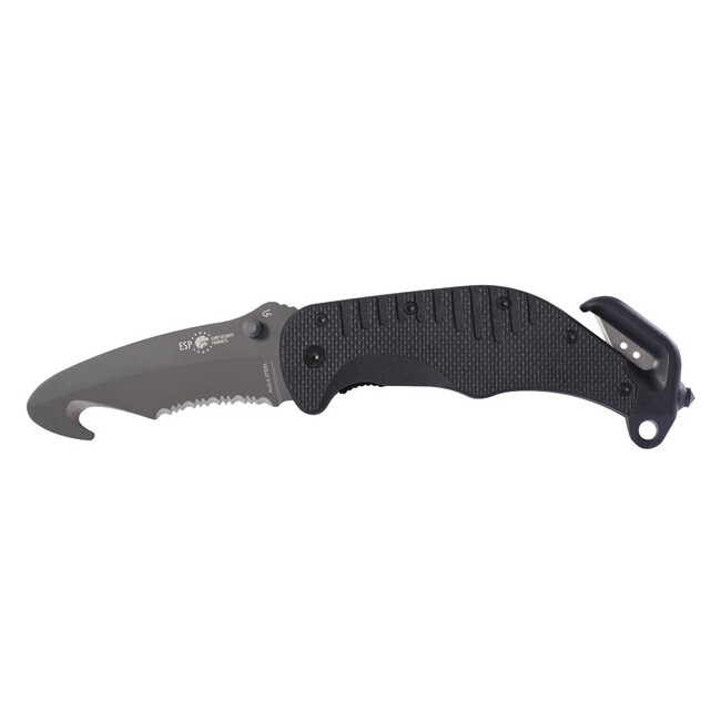 Špeciálny nôž českej značky ESP model RK-02 so špecifickým tvarom, ktorý je vhodný najmä pre záchranárske zložky a príslušníkov zborov väzenskej a justičnej stráže. Čepeľ s dĺžkou 95 mm je vyrobená z nožiarskej ocele typ AUS-8 s šedou titanovou povrchovou úpravou. Hrúbka čepele je 3 mm, je zúbkovitá a zakončená ostrým háčikom. Špecifické zakončenie čepele slúži napr. na rýchle rozrezanie bezpečnostného pásu auta pri autonehode, rozrezanie textilných pút alebo rozrezanie oblečenia ranenej osoby. Spoľahlivá poistka typu LINER LOCK sa odisťuje palcom. Rukoväť noža má príjemný ergonomický tvar dobre padnúci do dlane. Bolo použité inovatívne riešenie kovového klipu, ktorý je čiastočne zapustený v rukoväti a nevyčnieva z nej. Vďaka tomu sa nôž skvele drží pravákom i ľavákom. Unikátna konštrukcia noža je chránená priemyslovým vzorom. Jemná vzorka na povrchu črienky zabraňuje vykĺznutiu noža z ruky. Je vyrobená z odolného polyamidu PA6, takže toho vydrží naozaj veľa. Vďaka praktickému očku môžete nôž zavesiť na výstroj či zväzok kľúčov. Nôž je ďalej vybavený rozbíjačom skiel, v ktorom je vsadený hrot z tvrdokovu (karbid volfrámu - Tungsten carbide). Vďaka nemu aj nie príliš silným úderom spoľahlivo rozbijete sklo, napr. bočné okienka v automobiloch. Rozbíjací hrot nie je príliš ostrý, takže sa o neho pri bežnej manipulácii nemôžete zraniť. Dĺžka otvoreného noža je 217 mm a hmotnosť je 168 g.Nôž záchranársky RK-02Výrobca: ESPMateriál čepele: oceľ AUS-8Povrchová úprava čepele: PVDTyp poistky: LINER LOCKPovrch rukoväte: polyamid PA6Dĺžka otvoreného noža: 217 mmDĺžka čepele: 95 mmDĺžka zavretého noža: 133 mmHmotnosť: 168 gHrúbka čepele: 3 mmHrúbka rukoväte: 13 mmHrúbka rukoväte s kovovým klipom: 16 mm