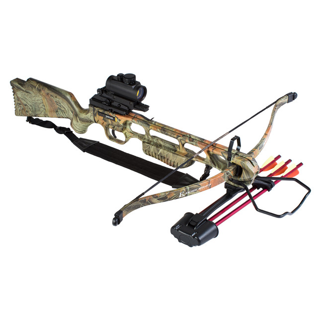 Reflexná kuša pre náročnejších strelcov s napínacou silou 175 lbs (80 kg). Súčasťou balenia sú pevné mieridlá, ale aj kolimátor s baterkou pre presnejšie mierenie. Pri každom natiahnutí sa kuša automaticky zaistí. Telo kuše je vyrobené z pevnej a odolnej hliníkovej zliatiny, lučisko je vyrobené z pevného a pružného sklolaminátu a pažba s podpažbím sú z odolného polyméru. Kuša je vhodná aj pre ľavákov aj pre pravákov. Rýchlosť šípu pri vystrelení je cca 220 fps, čo predstavuje cca 67 m/s. Maximálny dostrel je cca 500 m, mierený dostrel je cca 60 m. V tomto prípade ide o kušu v plnej výbave, nakoľko v cene je zahrnutý aj kolimátor, šípy a iné doplnky...POZOR ! Kušou sa nesmie strieľať naprázdno ! Kuša Jaguar camo 175 LbsKolimátor NášľapNapinák tetivyRemeňTulec3 ks šípov 16" HalfMoonMuška s mieridlamiVosk na tetivuNávod so záručným listomTyp kuše: reflexnáPoistka tetivy: anoNapínacia sila 175 lbs - 80 kgRozpätie lučišťa: 68,5 cmDĺžka kuše: 90 cmŠírka kuše: 68 cmDĺžka šípu max. 20" - 52 cmRýchlosť letiaceho šípu: 220 fps = 67 m/sPažba a podpažbie: Odolný polymérDostrel cca: 500 mMierený presný dostrel: 60 mFarba: CamoVáha: 4,40 Kga
