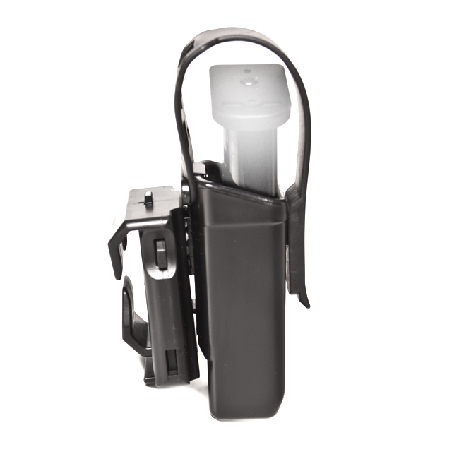 Plastové rotačné puzdro s poistným pásikom pre dvojradový zásobník pre kal. 9 mm Luger s fixačnou sponou typ UBC-01, ktorá umožňuje rotáciu puzdra o 360 stupňov a nasadenie puzdra bez…