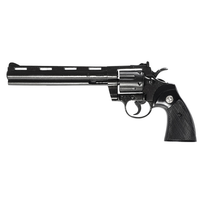 Nefunkčná replika svetoznámeho revolveru model Python kal. 357 Magnum. Vyrábala ho americká spoločnosť COLT v meste Hartford v rokoch 1955 až 2005. V U.S.A. našiel uplatnenie v malej miere aj v armáde aj v polícii. Bol obľúbený najmä vďaka skvelej presnosti a jemnej spúšti. Vyrábal sa s hlavňami dlhými 2.5´´, 3´´, 4´´, 6´´ a 8´´. V tomto prípade ide o prevedenie so 8´´ hlavňou. Replika má pohyblivý valec a spúšťový mechanizmus. Táto replika nie je určená na streľbu so žiadnym typom a kalibrom streliva. Slúži len na dekoračné alebo zberateľské účely. Replika revolveru Python USA 1955, 1 ksVýrobca: DenixDĺžka: 36 cmHmotnosť: 1 140 g