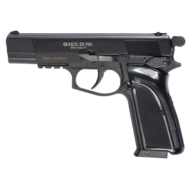 Na základe úspechu plynových (expanzných) zbraní značky Ekol sa turecký výrobca Voltran Silah Sanayi rozhodol rozšíriť svoju ponuku o vzduchové pištole a pušky. Model ES P66 kal. 4.5 mm / .177 je vzduchová pištoľ poháňaná bombičkou s obsahom 12 g CO2, ktorá sa vkladá do samostatného zásobníka spolu s oceľovými BBs brokmi a vydrží približne 50 výstrelov. Vyznačuje sa odolným polymérovým rámom a kovovým záverom, systémom spúšte SA / DA (Single Action / Double Action), zásobníkom s kapacitou 16 ks oceľových BBs brokov a úsťovou rýchlosťou až do 140 m/s. Celková dĺžka je 195 mm a hmotnosť je 573 g. Namiesto manuálnej poistky má tento model bezpečnostný vypúšťač bicieho ústrojenstva. Ekol ES P66 je napodobeninou známej belgickej pištole Browning HP35. Vzduchová pištoľ Ekol ES P66 kal. 4.5 mmZásobník, 1 ksPlastový kufrík, 1 ksNávod + záručný listVýrobca: Voltran (EKOL)Kaliber: 4.5 mm / .177Strelivo: oceľové BBs brokyKapacita: 16 ránPrincíp fungovania: 12 g CO2 bombičkaÚsťová rýchlosť: do 140 m/sCelková dĺžka: 195 mmDĺžka hlavne: 125 mmHmotnosť: 573 gBlow-Back: niePoistka: nieMontáž: nieTyp hlavne: hladkáRežim streľby: semi-autoTyp spúšte: SA / DA